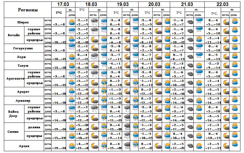 Днем 17-го, с 18-19, днем 21-го марта в отдельных регионах ожидаются кратковременные осадки, возможна гроза. 20-го, ночью 21-го, 22-го марта ожидается погода без осадков.