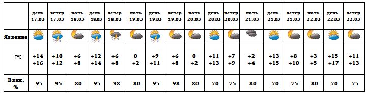 В вечерние часы 17-го, с 18-19 марта время от времени ожидается кратковременный дождь, возможна гроза. С 20-22 марта ожидается погода без осадков.