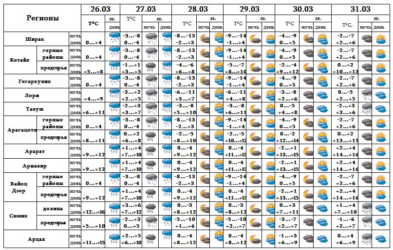 Днем 26-го, 27-го марта в большинстве регионов, ночью 31-го в регионах Лори, Тавуш, Сюник и в Арцахе время от времени ожидаются осадки, 27-го в горных регионах и предгорьях - в виде снега. С 28-30, днем 31-го марта ожидается погода без осадков.