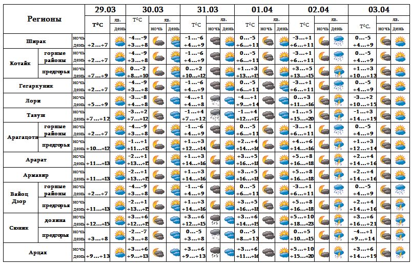 Днем 29-го, 30-го, днем 31-го марта, 1-го ночью 2-го и 3-го апреля ожидается погода без осадков. Ночью 31-го марта в регионах Лори, Тавуш, Сюник и в Арцахе, днем 2-го апреля в большинстве регионов, днем 3-го в южных регионах ожидаются осадки, возможна гроза.