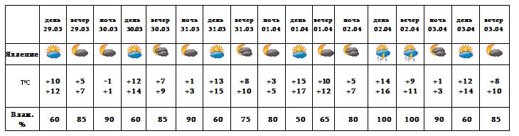 Днем 29-го, с 30-31 марта, 1-го ночью 2-го, 3-го апреля ожидается погода без осадков. Днем 2-го апреля ожидается кратковременный дождь с грозой.