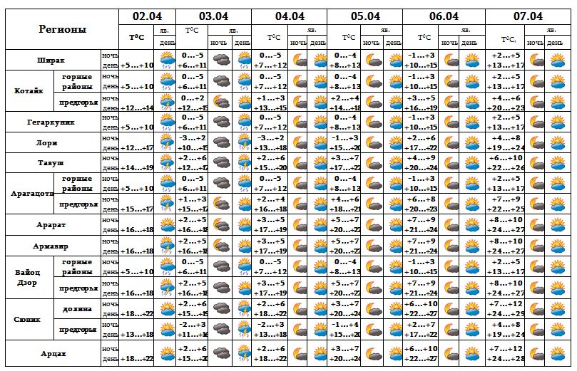 Из-за проникновения тропической волны горячего воздуха с Аравийского полуострова с 4-7 апреля по всей территории республики температура воздуха постепенно повысится на 8-10 градусов. В долинах Сюника уже днем 7-го апреля температура воздуха достигнет + 26… + 29, в Араратской долине и городе Ереван +24… + 27 градусов.