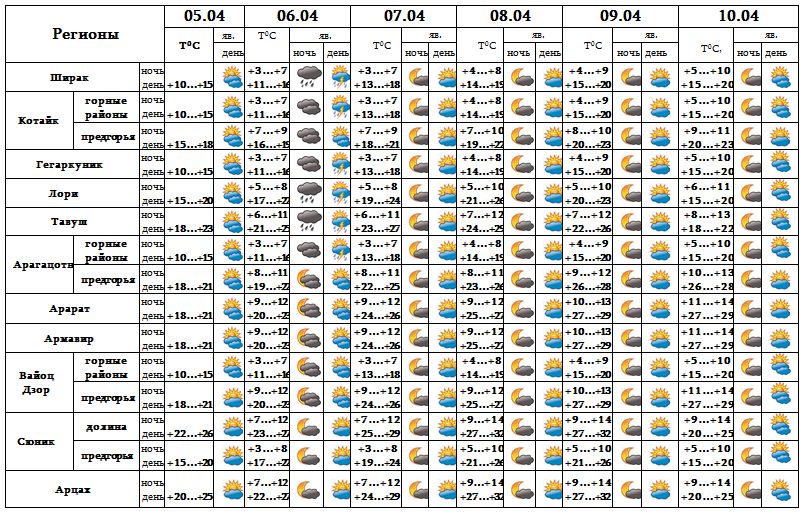 С 5-9 апреля по всей территории республики температура воздуха постепенно повысится на 8-10 градусов из-за проникновения тропической теплой воздушной массы с Аравийского полуострова. Днем с 8-9 апреля в долинах Сюника температура воздуха достигнет + 28… + 32, в Араратской долине и городе Ереван - +27… + 29 градусов.
