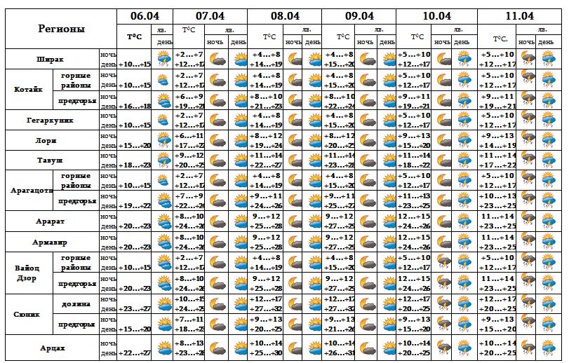С 6-9 апреля по всей территории республики температура воздуха постепенно повысится на 8-10 градусов из-за проникновения тропической теплой воздушной массы с Аравийского полуострова. Днем с 8-9 апреля в долинах Сюника температура воздуха достигнет + 28… + 32, в Араратской долине и городе Ереван - +27… + 29 градусов.