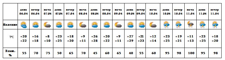 Днем 6-го, с 7-9 апреля ожидается погода без осадков. С 10-11 апреля ожидается кратковременный дождь с грозой.