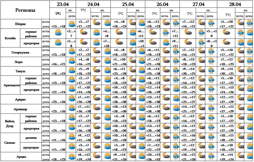 Днем 23-го апреля, с 24-25 апреля ожидается погода без осадков, 26-го, 28-го апреля в основном после полудня и ночью в отдельных регионах ожидается кратковременный дождь с грозой, в отдельных местах возможен град.