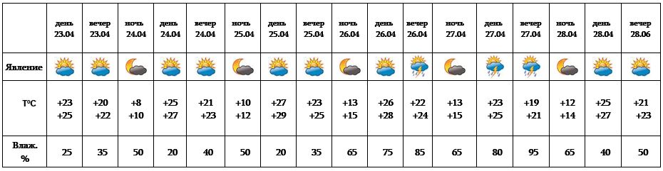Днем 23-го, с 24-25 апреля, 28-го ожидается погода без осадков, в вечерние часы 26-го апреля, после полудня и ночью 27-го ожидается кратковременный дождь с грозой, во время грозы ожидается усиление ветра до 15-20 м/с.