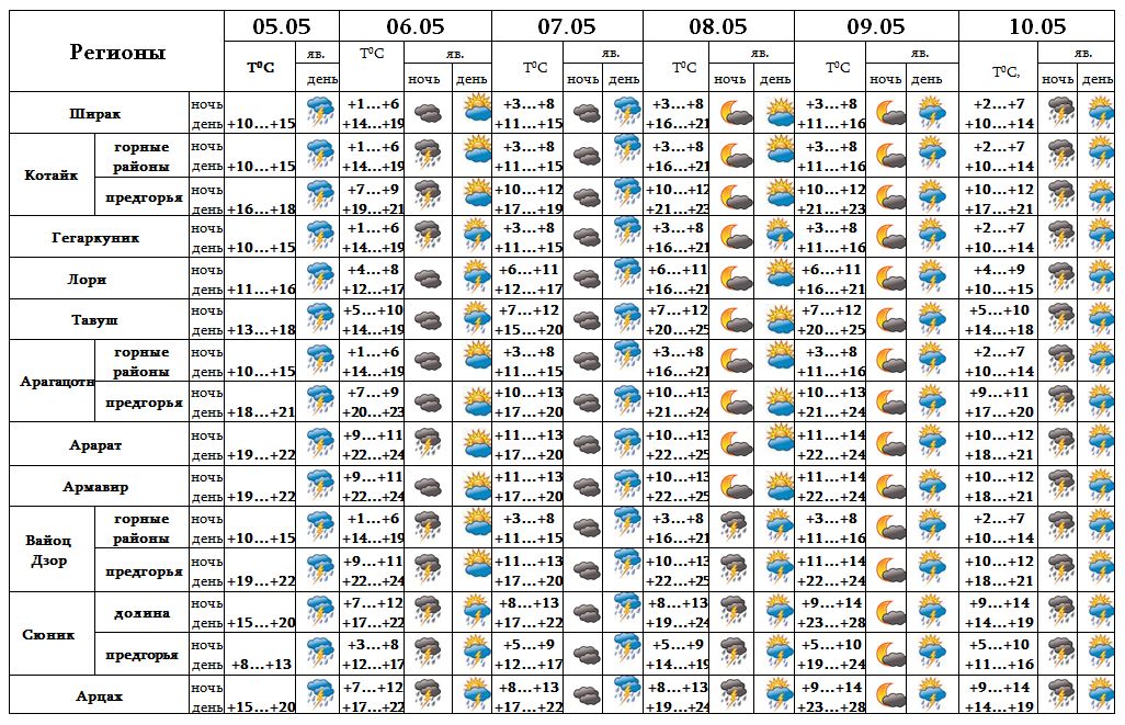 Днем 5-го, 7-го, 10-го время от времени, после полудня 9-го мая во всех регионах ожидается дождь с грозой, местами – интенсивно. 6-го, после полудня 8-го мая в отдельных регионах ожидается кратковременный дождь с грозой. В отдельных местах возможен град.