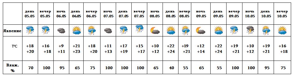 Днем 5-го, 7-го, 10-го время от времени, после полудня 9-го мая ожидается дождь с грозой, во время грозы возможно усиление ветра до 15-20 м/с. 6-го, 8-го мая в основном вечером в отдельных местах города ожидается кратковременный дождь с грозой.