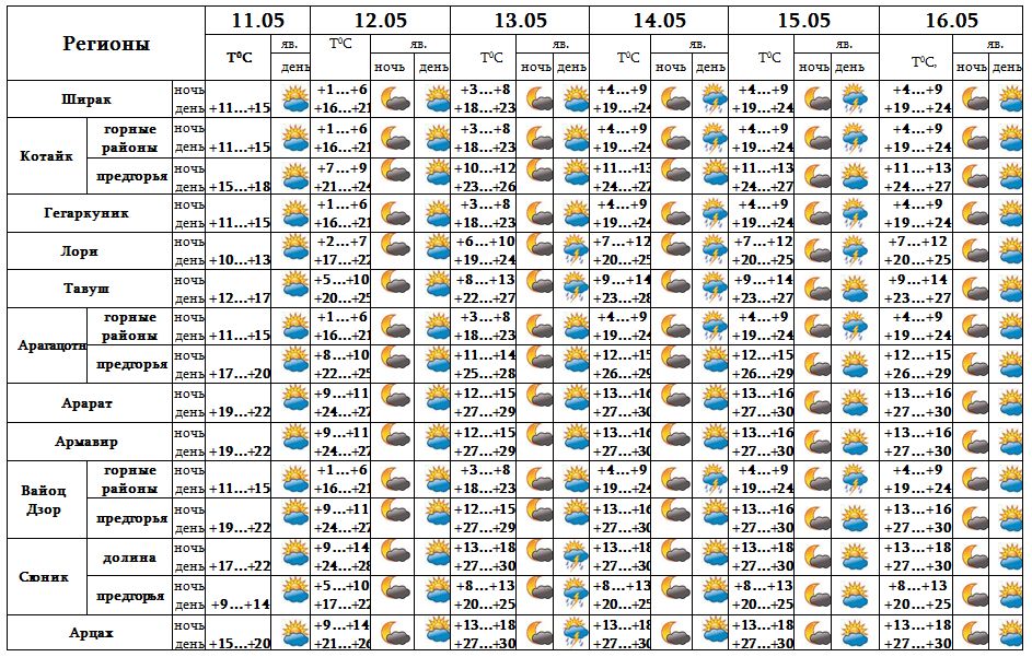 Днем 11-го, 12-го, 16-го мая ожидается погода без осадков. После полудня с 13-15 мая в отдельных регионах ожидается кратковременный дождь с грозой. В отдельных местах возможен град.