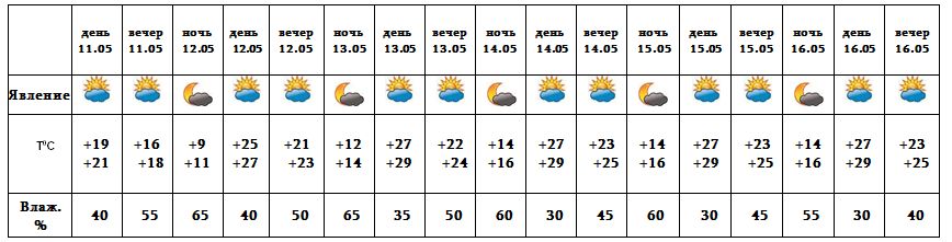 Днем 11-го, с 12-16 мая ожидается погода без осадков.