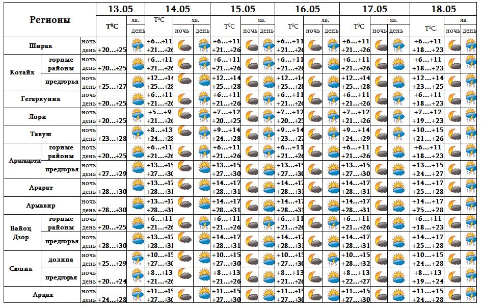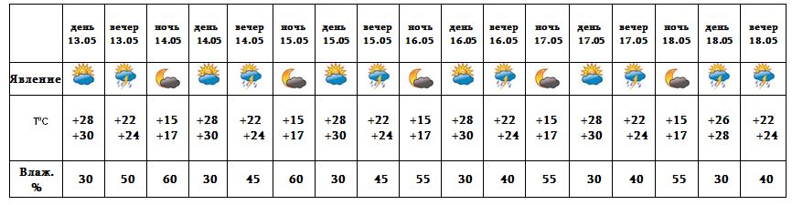 Днем 13-го, после полудня с 14-17 мая в отдельных регионах, днем 18-го в большинстве регионов ожидается кратковременный дождь с грозой. В отдельных местах возможен град.