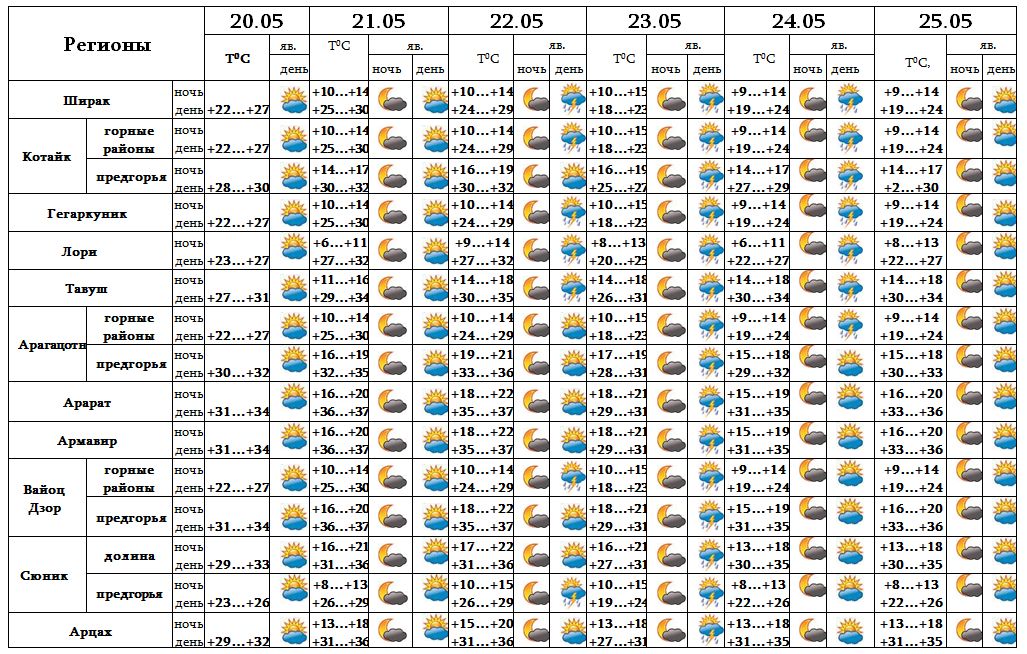 Днем 20-го, 21-го, 25-го мая ожидается погода без осадков. 22-го, после полудня 24-го мая в отдельных регионах, 23-го в большинстве регионов ожидается кратковременный дождь с грозой. В отдельных местах возможен град.