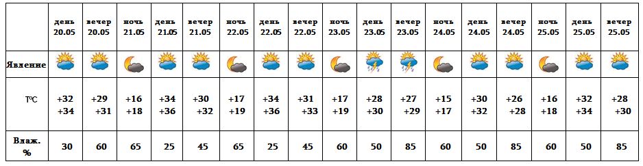 Днем 20-го, с 21-22, 24-25 мая ожидается погода без осадков. После полудня 23-го мая ожидается дождь с грозой.