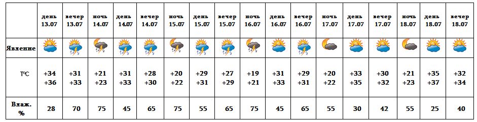 В вечерние часы 13-го, с 14-16 июля ожидается кратковременный дождь с грозой, во время грозы ожидается усиление ветра до 15-20 м/с. С 17-18 июля ожидается погода без осадков.