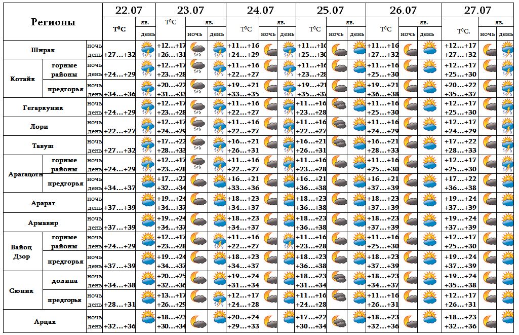 В основном после полудня с 22-24, 27-го июля в отдельных регионах ожидается дождь с грозой, в отдельных местах возможен град. С 25-26 июля ожидается погода без осадков