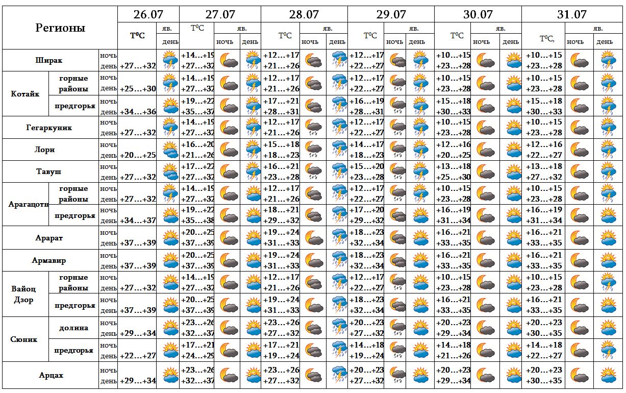 С 26-27, 29-го, 31-го июля в отдельных регионах, 28-го в большинстве регионов в основном после полудня и ночью ожидается дождь с грозой, в отдельных местах возможен град. 30-го июля ожидается погода без осадков.