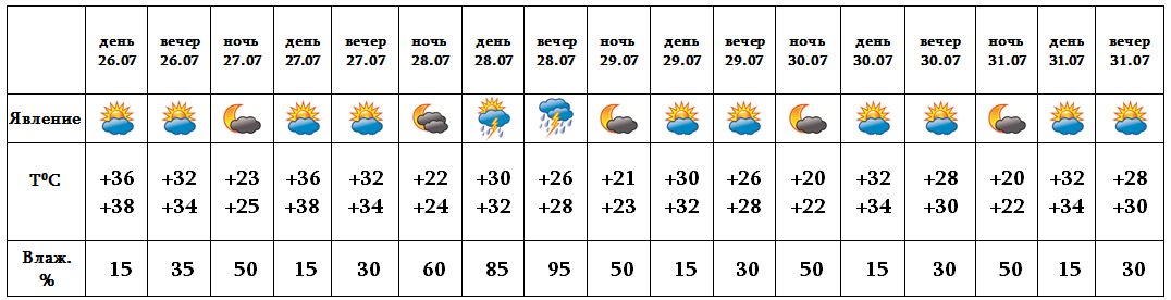 Днем 26-го, 27-го, с 29-31 июля ожидается погода без осадков. После полудня 28-го июля ожидается дождь с грозой, во время грозы возможно усиление ветра до 18-20 м/с.