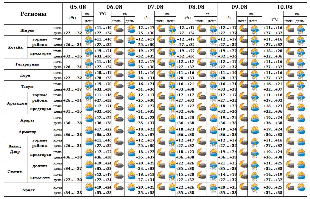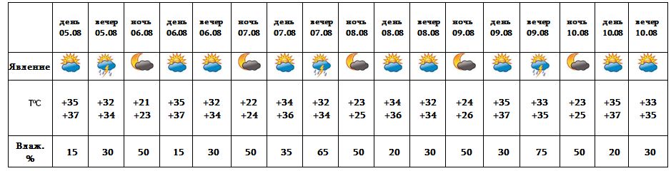 5-го, после полудня 9-го в вечерние часы 7-го августа в отдельных местах ожидается кратковременный дождь с грозой, во время грозы возможно усиление ветра до 18-20 м/с. 6-го, 8-го, 10-го августа ожидается погода без осадков.