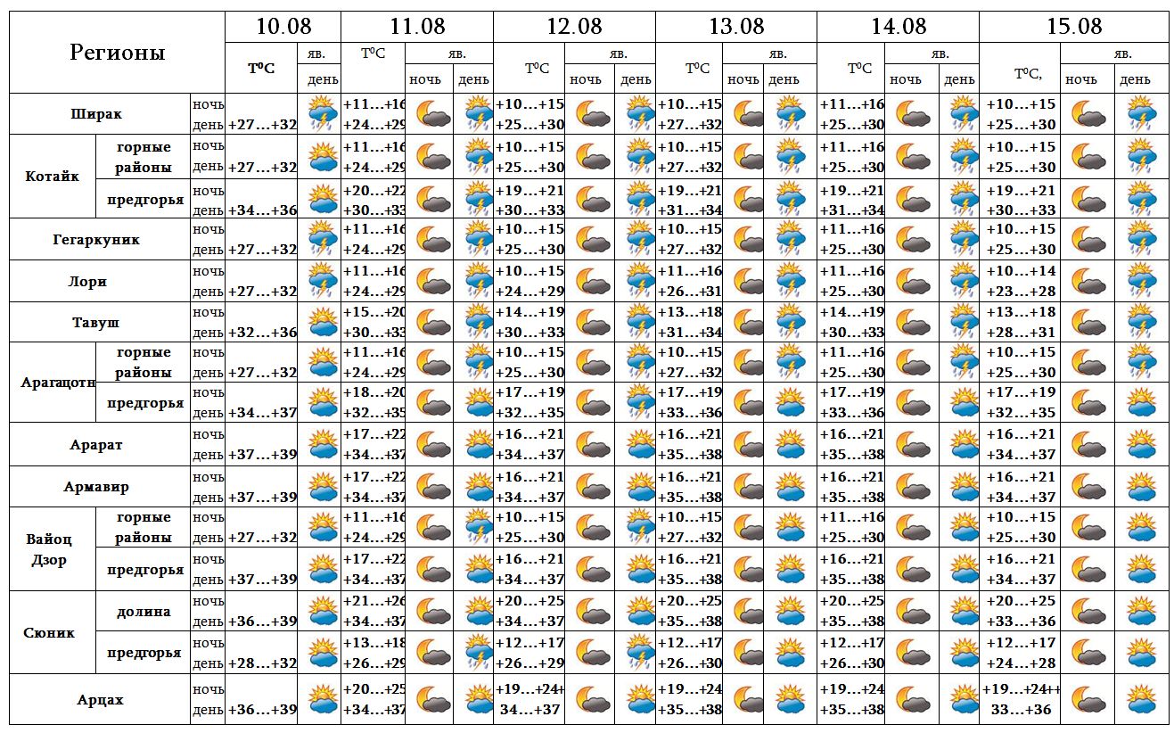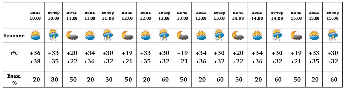 Вечером и ночью с 10-15 августа в отдельных местах города ожидается кратковременный дождь с грозой, во время грозы возможно усиление ветра до 18-20 м/с.