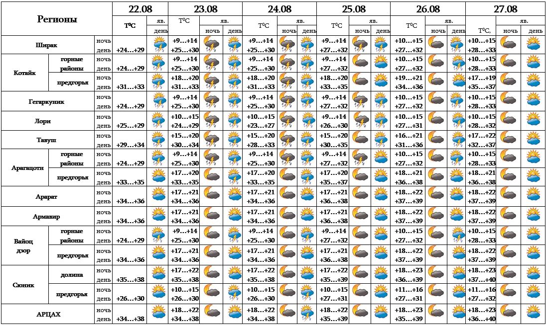 Днем 22-го августа, ночью и после полудня с 23-26 в отдельных регионах ожидается кратковременный дождь с грозой, в отдельных местах также возможен град. 27-го августа ожидается погода без осадков.