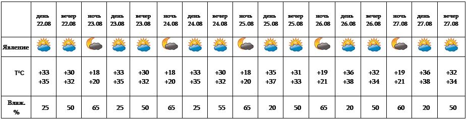 Днем 22-го августа, с 23-27 ожидается погода без осадков, в вечерние часы возможно усиление ветра до 16-18 м/с.