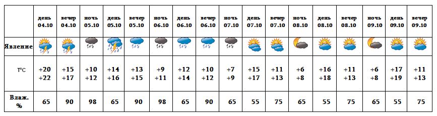 Днем 5-го, 6-го, ночью 7-го октября время от времени ожидается дождь с грозой. Днем 7-го, с 8-10 октября ожидается погода без осадков.