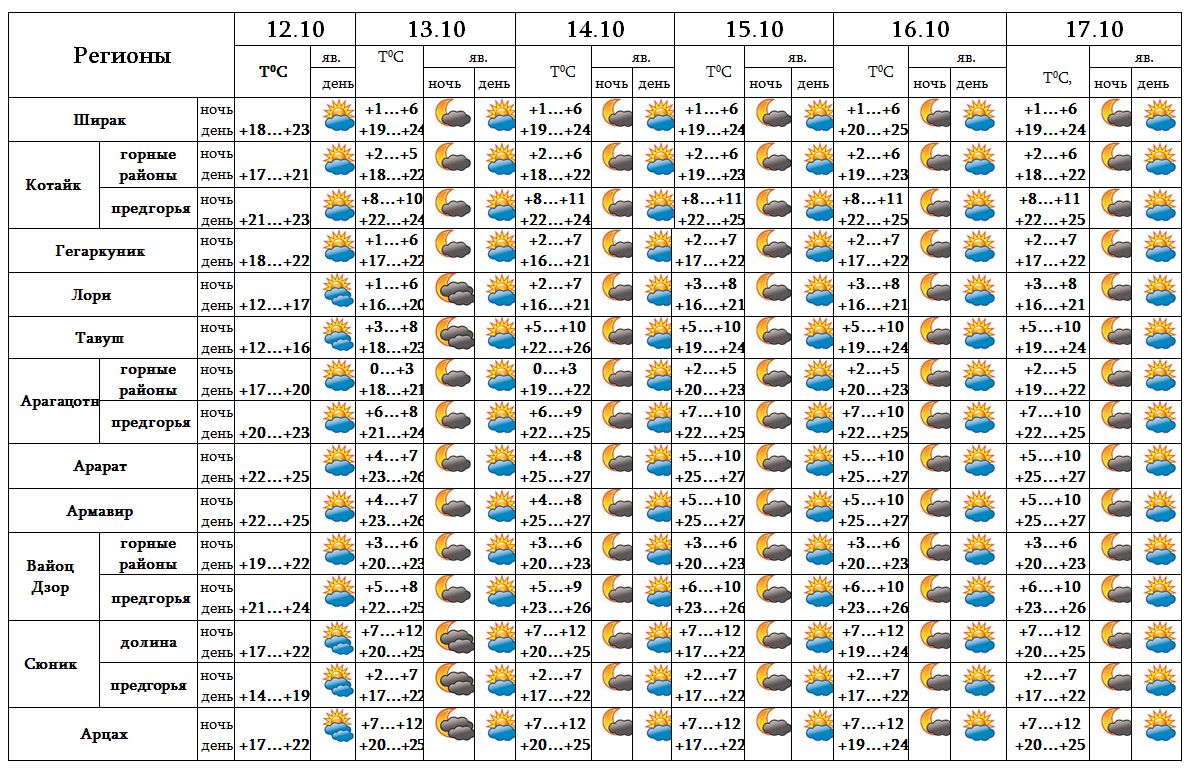 Днем с 12-14 октября температура воздуха постепенно повысится на 3-4 градуса, в регионах Лори, Тавуш, Сюник и в Арцахе – 8-10 градусов.