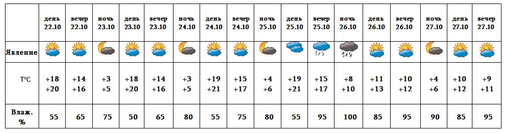 Днем 22-го, ночью 25-го, днем 26-го, 27-го октября ожидается погода без осадков. В вечерние часы 25-го, ночью 26-го ожидается дождь.