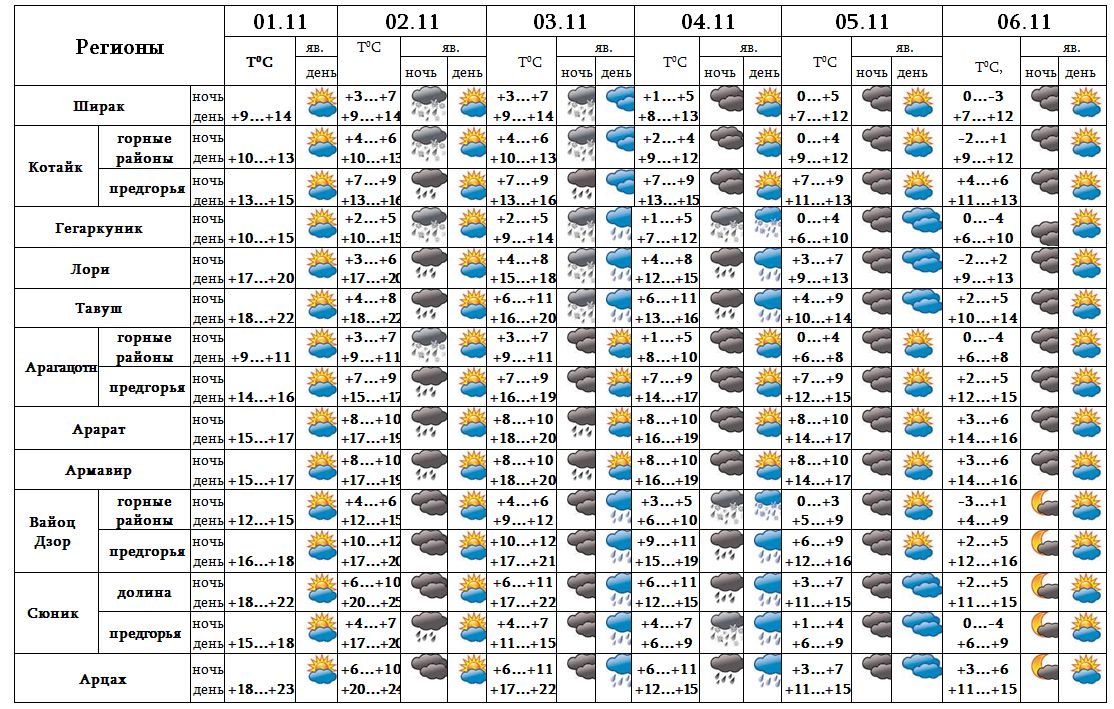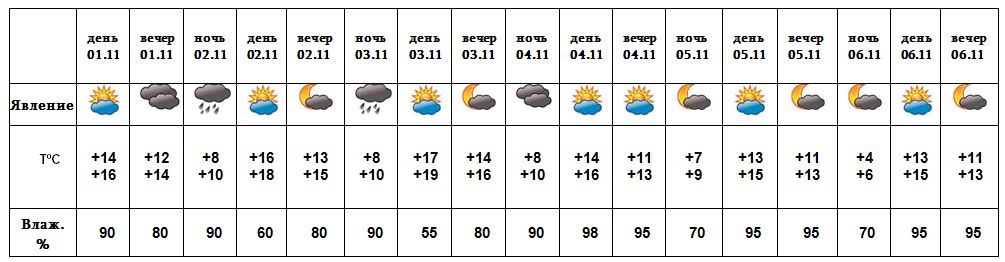 Днем 1-го, с 4-6 ноября ожидается погода без осадков. Ночью и в утренние часы 2-го и 3-го ноября ожидается дождь.