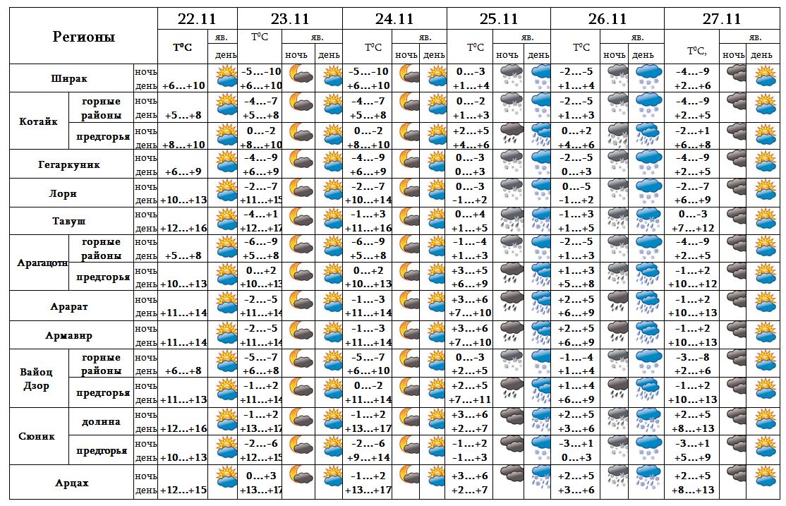 Днем 25-го ноября температура воздуха понизится на 3-5 градусов, в регионах Лори, Тавуш, Сюник и в Арцахе на 9-11 градусов.