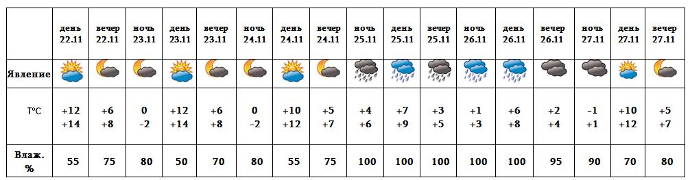 Днем 22-го, с 23-24, 27-го ноября ожидается погода без осадков. С 25-26 ноября ожидается дождь.