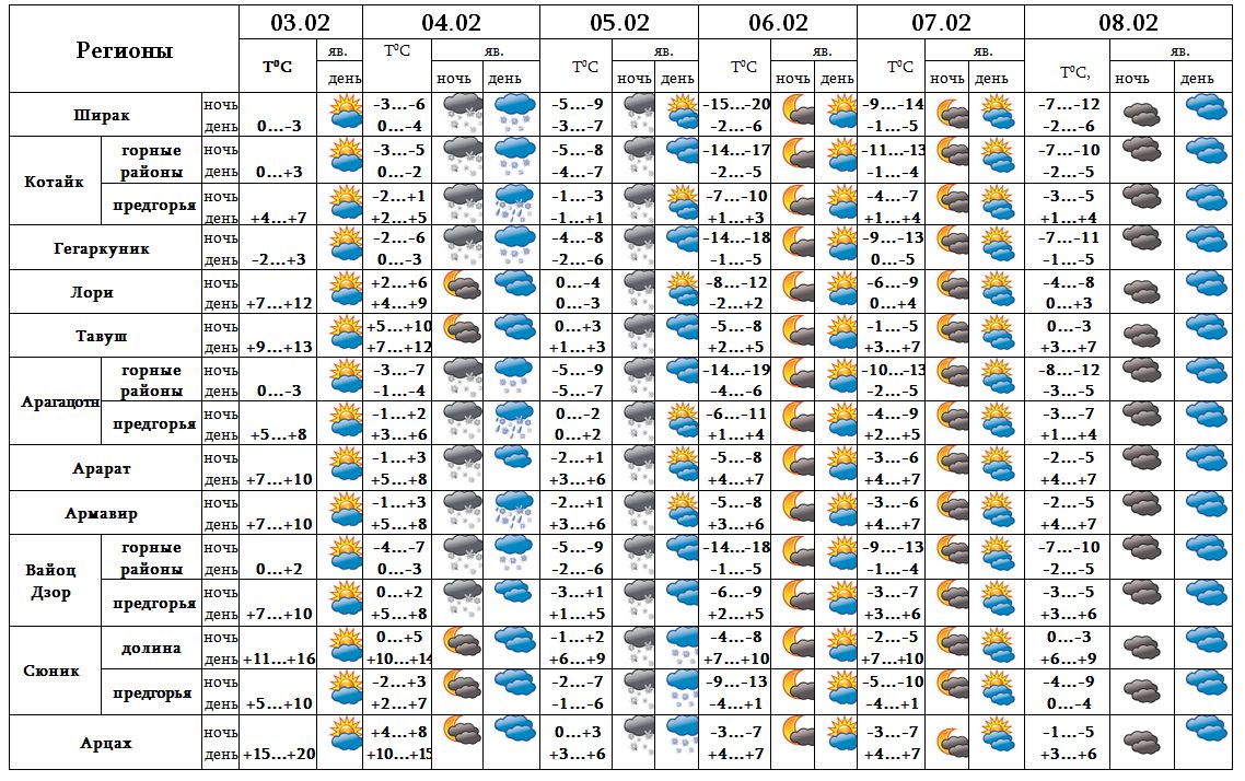 Днем 3-го, с 6-8 февраля ожидается погода без осадков. 4-го, ночью и утром 5-го февраля ожидаются небольшие осадки.