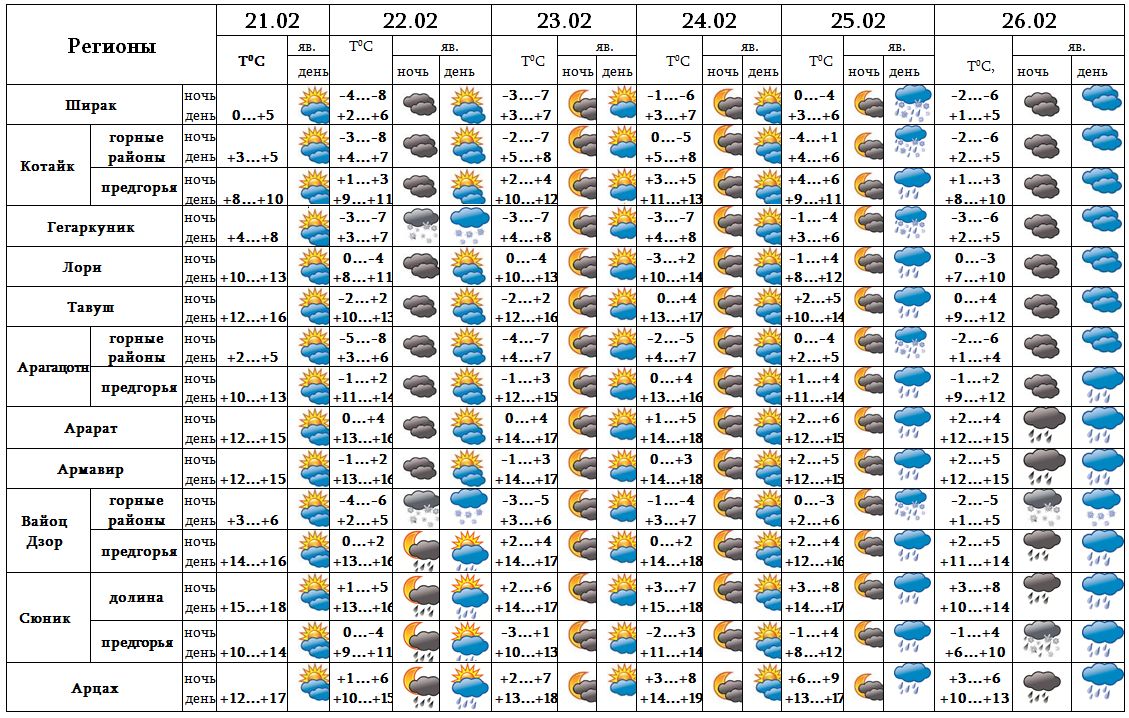 Днем 21-го, с 23-24, ночью 25-го февраля ожидается погода без осадков. 22-го февраля в отдельных регионах, днем 25-го, 26-го в большинстве регионов ожидаются осадки, в горных районах - в виде снега.