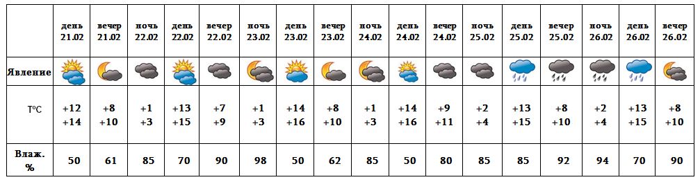 Днем 21-го, с 23-24, ночью 25-го февраля ожидается погода без осадков. 22-го февраля в отдельных местах города возможен слабый и кратковременный дождь. Днем 25-го, 26-го ожидается дождь.