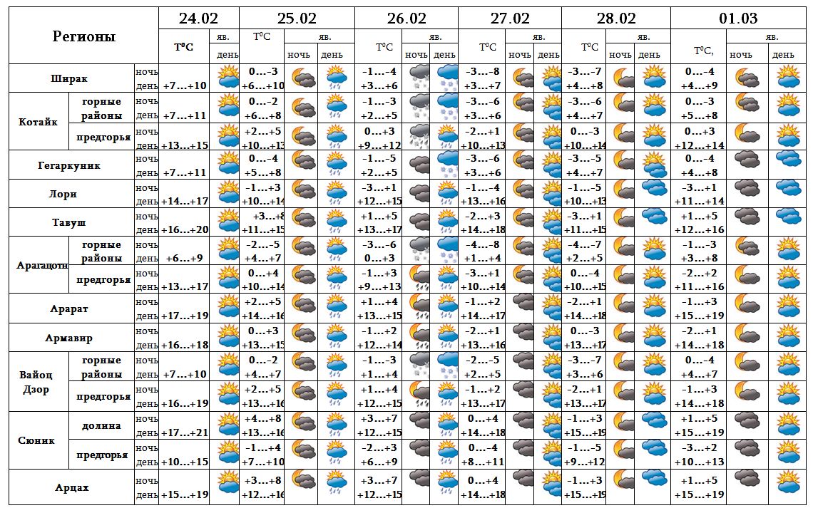 Днем 24-го, ночью 25-го, днем с 27-28 февраля, 1-го марта ожидается погода без осадков. Днем 25-го, 26-го февраля в большинстве регионов, ночью 27-го в отдельных регионах ожидаются осадки.