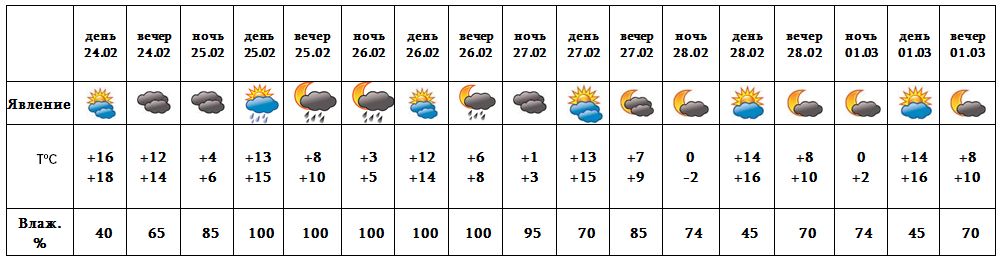 Днем 24-го, ночью 25-го, с 27-28 февраля, 1-го марта ожидается погода без осадков. Днем 25-го, 26-го время от времени ожидается кратковременный дождь. 25-го февраля в отдельных районах ожидается усиление ветра с порывами до 15-18 м/с.