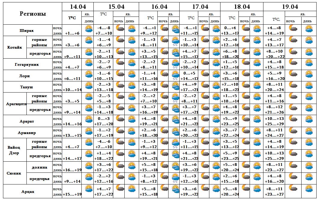 Днем 14-го, 15-го, ночью 16-го, с 17-19 апреля ожидается погода без осадков. .Днем 16-го апреля в отдельных регионах ожидается кратковременный дождь.
