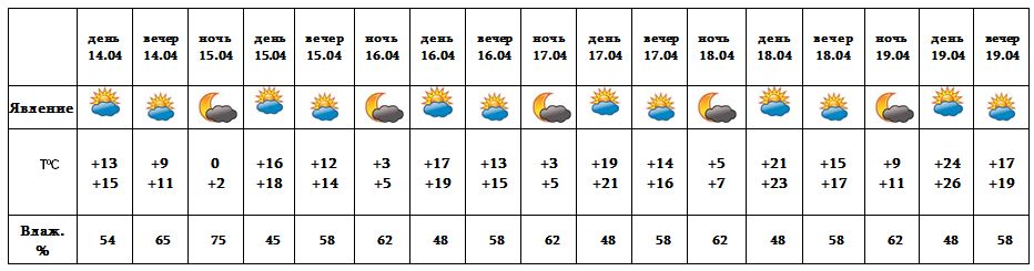 Днем 14-го, с 15-19 апреля ожидается погода без осадков.