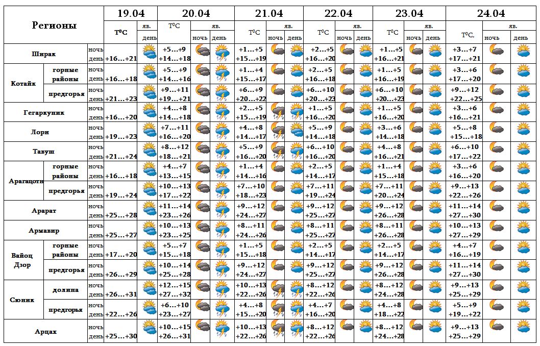 Днем 19-го, ночью 20-го, с 22-24 апреля ожидается погода без осадков. Днем 20-го апреля в большинстве регионов, 21-го в отдельных регионах ожидается кратковременный дождь с грозой.