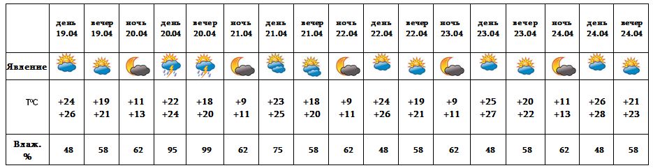 Днем 19-го, ночью 20-го, с 21-24 апреля ожидается погода без осадков. После полудня 20-го апреля ожидается кратковременный дождь с грозой, во время грозы ожидается усиление ветра с порывами до 14-17 м/с.