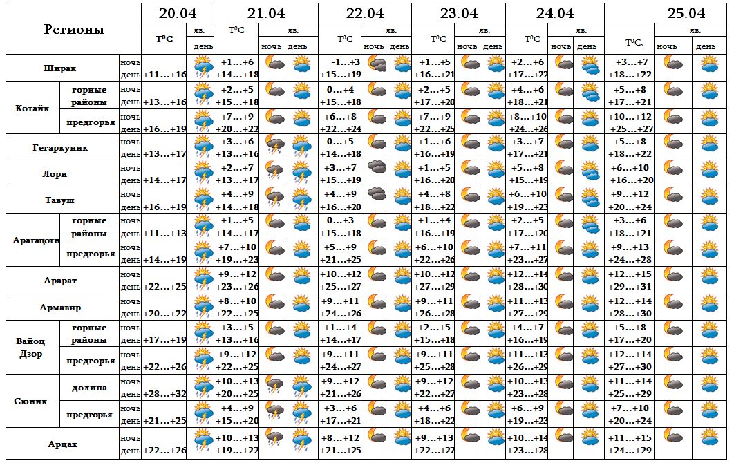 Днем 20-го апреля в большинстве регионов, 21-го в отдельных регионах ожидается кратковременный дождь с грозой. С 22-25 апреля ожидается погода без осадков.