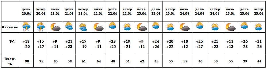 После полудня 20-го апреля ожидается кратковременный дождь с грозой, во время грозы ожидается усиление ветра с порывами до 14-17 м/с. С 21-25 апреля ожидается погода без осадков.
