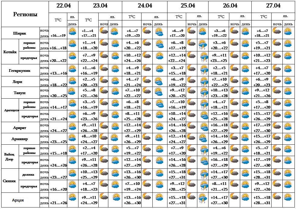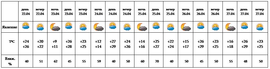 Днем 22-го, с 23-24, ночью 25-го, с 26-27 ожидается погода без осадков. Днем 25-го апреля в отдельных регионах ожидается кратковременный дождь с грозой.