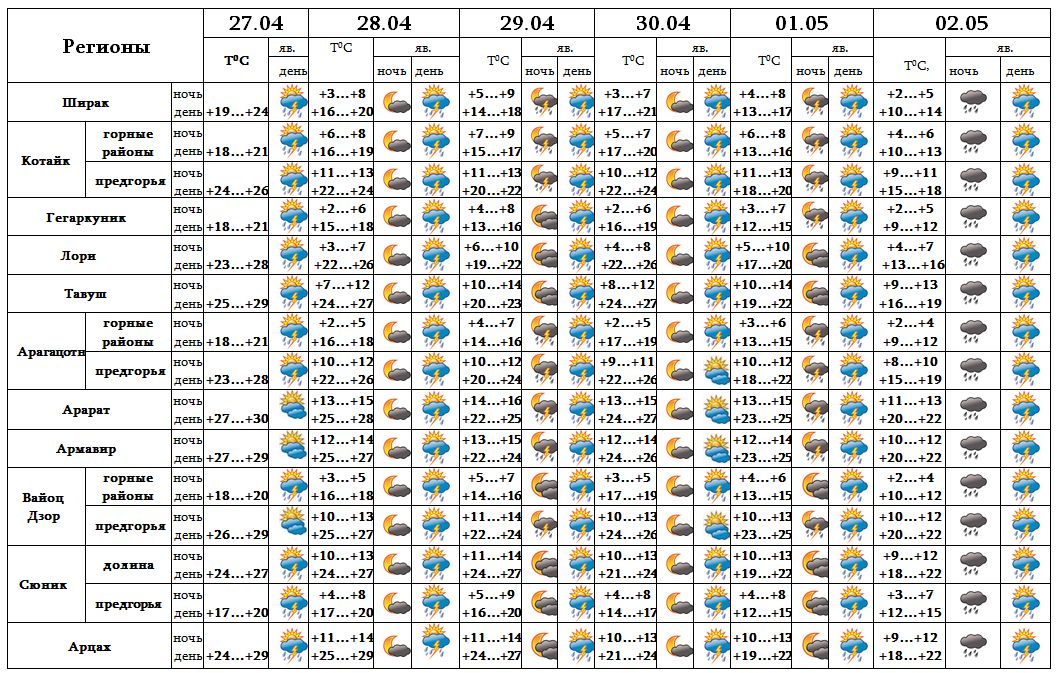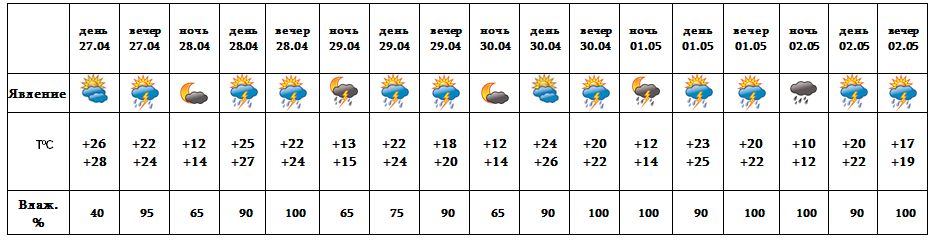 Днем 27-го, 30-го апреля в отдельных регионах ожидается кратковременный дождь с грозой, после полудня 28-го, 29-го, с 1-2 мая в большинстве регионов время от времени ожидается дождь с грозой. Ночью 28-го и 30-го апреля ожидается погода без осадков.
