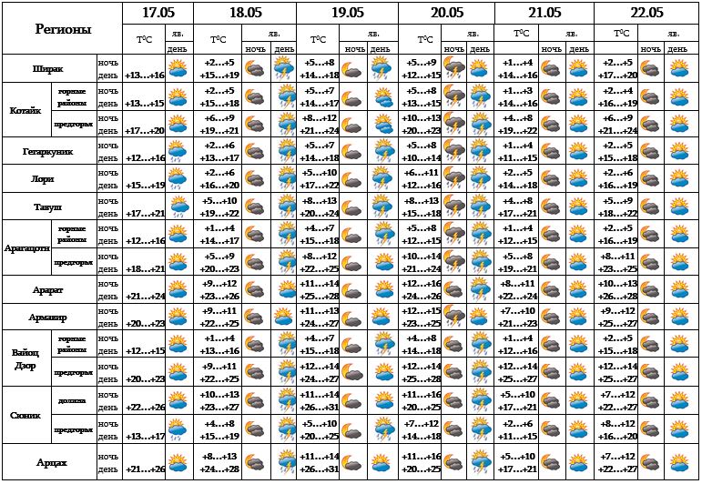 Днем 17-го, после полудня с 18-19, 20-го мая в отдельных регионах ожидается кратковременный дождь с грозой, в отдельных местах возможен град. С 20-21 ожидается погода без осадков.