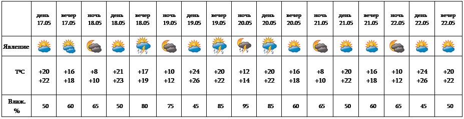 Днем 17-го мая, с 21-22 ожидается погода без осадков. Вечером 18-го мая возможен, а вечером 19-го, 20-го ожидается кратковременный дождь с грозой, во время грозы - усиление ветра с порывами до 15-18 м/с.