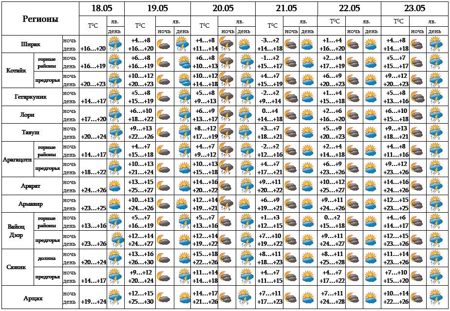 После полудня с 18-19, ночью и после полудня 20-го мая в отдельных регионах, после полудня 23-го в большинстве регионов ожидается кратковременный дождь с грозой, в отдельных местах возможен град. С 21-22 ожидается погода без осадков.