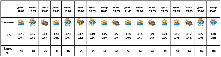 Вечером 18-го мая возможен, а вечером 19-го, ночью и после полудня 20-го, после полудня 23-го ожидается кратковременный дождь с грозой, во время грозы - усиление ветра с порывами до 15-18 м/с. С 21-22 ожидается погода без осадков.