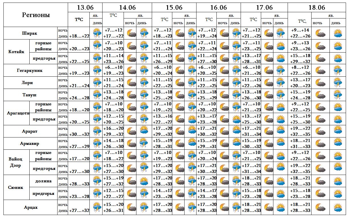 После полудня 13-го, ночью и после полудня с 14-16 июня в большинстве регионов, с 17-18 в отдельных регионах ожидается кратковременный дождь с грозой. В отдельных местах также ожидается град.